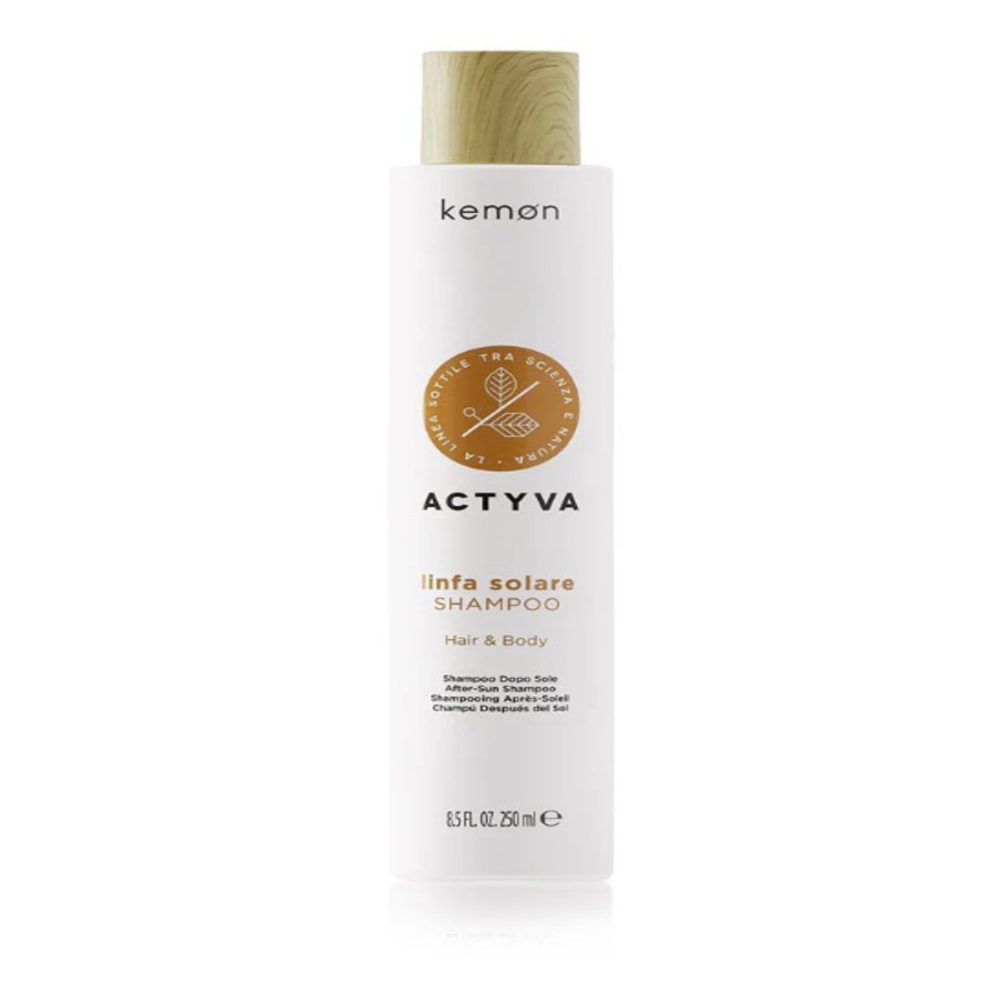 Kemon Actyva linfa solare shampoo 250ml, Hidratante pós-sol para corpo e cabelo. Limpa e neutraliza suavemente os efeitos dessecantes do sol, sal e cloro. Deixa o cabelo sedoso e leve; a pele macia e delicadamente perfumada. Dá uma agradável sensação de frescura.